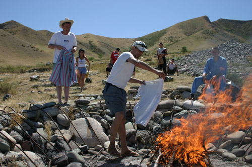 بعد طقوس ربط قطعة القماش ينزل المرضى إلى كومة من الحجارة ويحرقون ملابسهم القديمة، ولديهم الآن وجهات متعددة ولكن ليس للوراء. فالنار تلتهم القذارة وتحول القماش إلى رماد.
