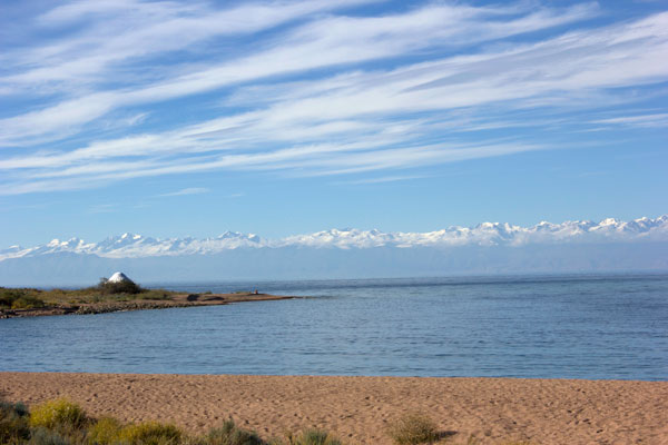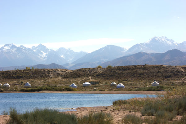 Ici, à 50 mètres de la plage, s’est étendu le village de yourtes avec une vue sur le lac salé qui fait tourner la tête. On voit à peine l’horizon. Il se mêle harmonieusement aux montagnes d’un blanc éclatant, qui entourent Issyk-Koul. On a l’impression qu’ici le temps suit son propre rythme et on a le pouvoir de le ralentir ou l’accélérer. Le minimum de civilisation et le maximum de conditions naturelles de ce lieu sont appelés d’aider leurs hôtes de se mettre dans l’ambiance.